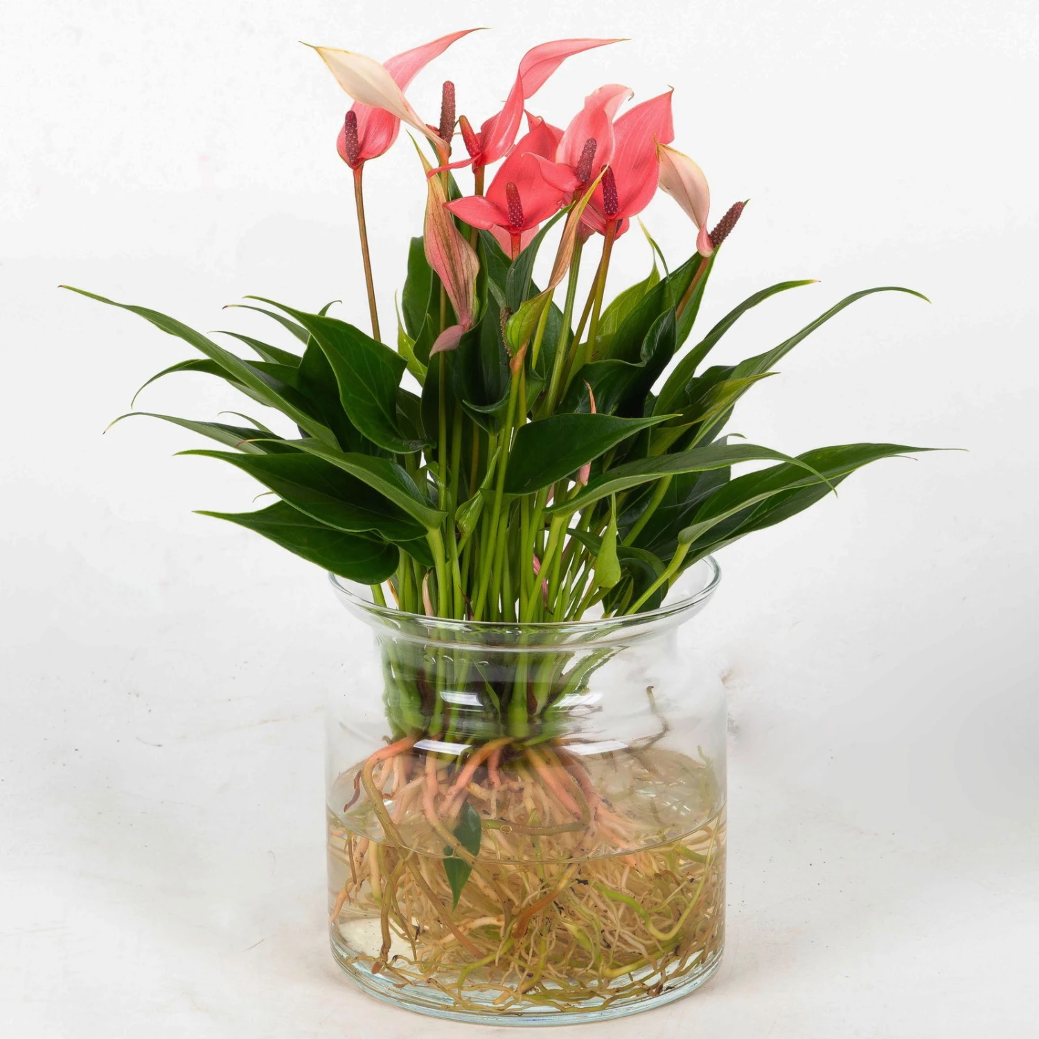 Mit dieser exklusiven Pflanzenschönheit holen Sie sich einen ganz besonderen Eyecatcher nach Hause: Diese exotische Flamingoblume (Anthurium) der Sorte ‚Lilli‘ kommt ganz ohne Erde aus und gedeiht ausschließlich in Wasser. In Kombination mit den rosa, lackartigen Hüllblättern der Blüten und den glänzenden, lanzettlichen Blättern ziehen die freigelegten Wurzeln in der modernen Glasvase mit Sicherheit alle Blicke auf sich! Aber auch als Geschenk ist diese Rarität für jeden Zimmergärtner eine schöne Idee.